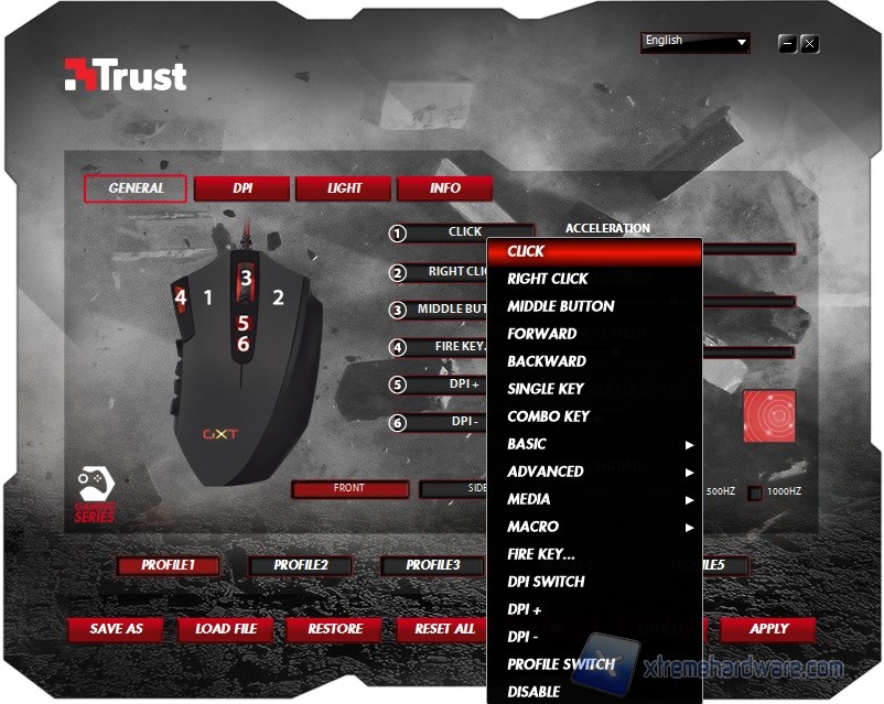 Una volta aperto il software di gestione ci troviamo di fronte il primo Menù “General” relativo alla personalizzazione dei tasti G e non, con relative funzioni o Macro che dovranno essere create tramite l’editor che vedremo dopo. In questo Menù non mancano i settaggi del Polling rate del mouse, dell’accelerazione o ancora del doppio click e così via. Il software di gestione permette con estrema semplicità di creare 5 profili e di personalizzarli in ogni momento. Ricordiamo che i profili verranno salvati immediatamente nella memoria On-Board del mouse. Aggiungiamo che comunque per accedere alla personalizzazione dei 18 tasti G dovremo cliccare sulla tab “Side” che aprirà un nuovo Menù di personalizzazione.