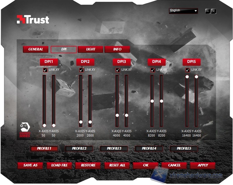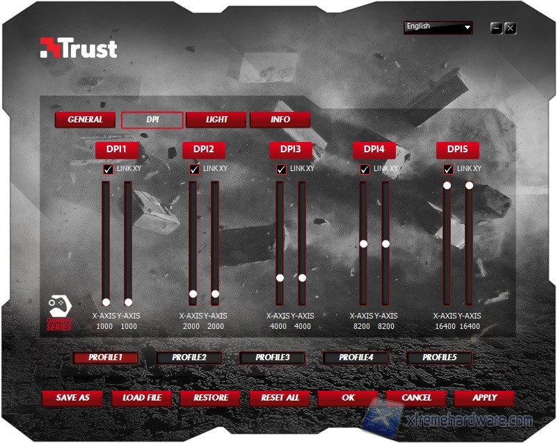 Il Menù successivo è “DPI” ove avremo modo di settare i DPI del nostro mouse da un minimo di 1000 ad un massimo di 16400. Come possiamo notare gli Step dei DPI sono prestabiliti a (1000, 2000, 4000, 8200, 16400dpi) ma tramite un semplice spostamento del cursore vero l’alto o verso il basso potremo passare da 50 a 16400 DPI così da coprire tutte le risoluzioni che un gamer potrebbe richiedere ad un mouse. Inoltre, i DPI permettono l’utilizzo del GXT 166 MMO ad un giocatore sia Low Senser che High Senser. Altra opzione da poter configurare è la regolazione ad assi indipendenti della risoluzione, possibile togliendo la spunta dalla voce “LINK XY”. Sarà quindi possibile settare i DPI dell’asse X o di quello Y a seconda delle nostre necessità.