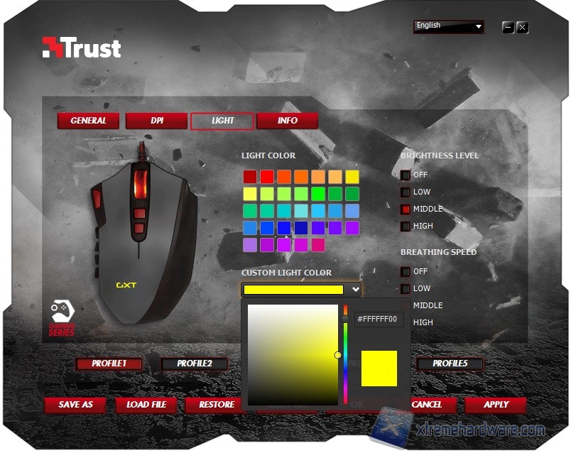 Proseguendo, troviamo il Menù “Light” che come ci fa intuire ci permetterà di variare il colore dell’illuminazione del mouse nonché l’intensità. Avremo modo di variare il colore del logo GXT e quello dei tasti G a seconda dei nostri gusti e degli svariati colori messi a disposizione nel pannello di gestione del mouse. Per rimanere nello stile caratteristico del mouse suggeriamo di settare il colore rosso dato che lo Scroll ha un LED fisso di questo colore che non sarà possibile configurare a piacimento. Ovviamente l’utente potrà comunque decidere quale colore scegliere per il logo GXT e per i tasti secondo i propri gusti personali. Inoltre, vi è la possibilità di modificare l’intensità e la velocità dell’illuminazione tramite vari step che sono OFF, LOW, MIDDLE ed HIGH. Non manca dunque nulla.