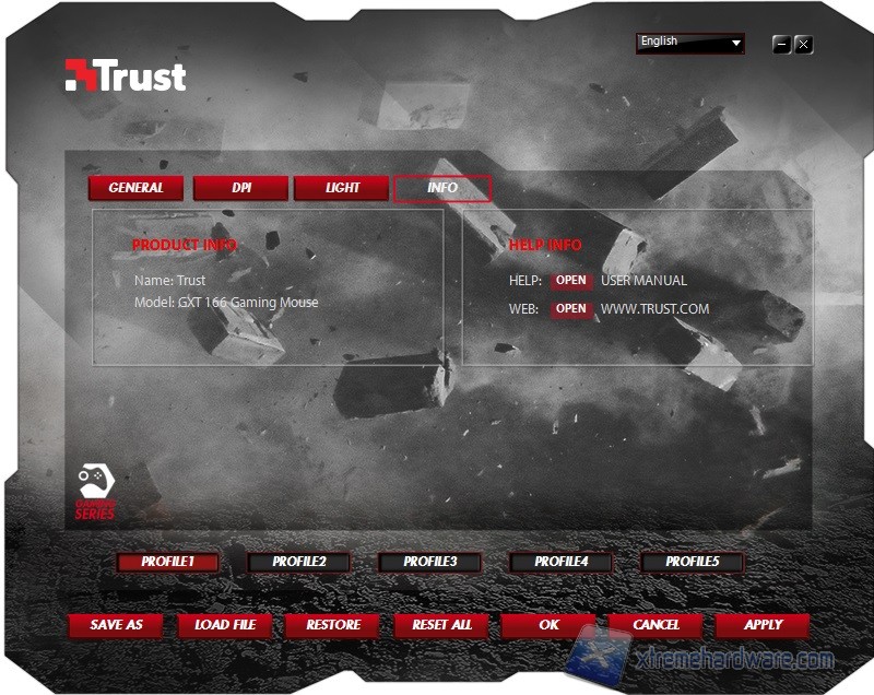 Infine troviamo il Menù “Info” ove sono presenti il nome del prodotto e due link, uno diretto al manuale utente online del mouse, l’altro al sito http://www.trust.com/gxt-166-mmo-gaming-mouse